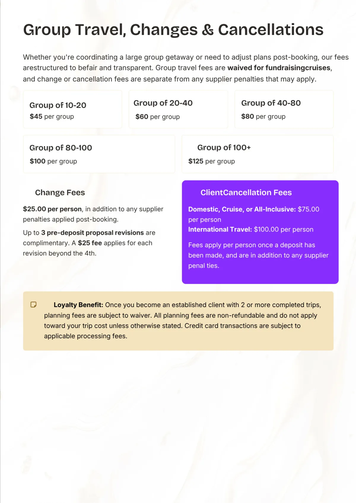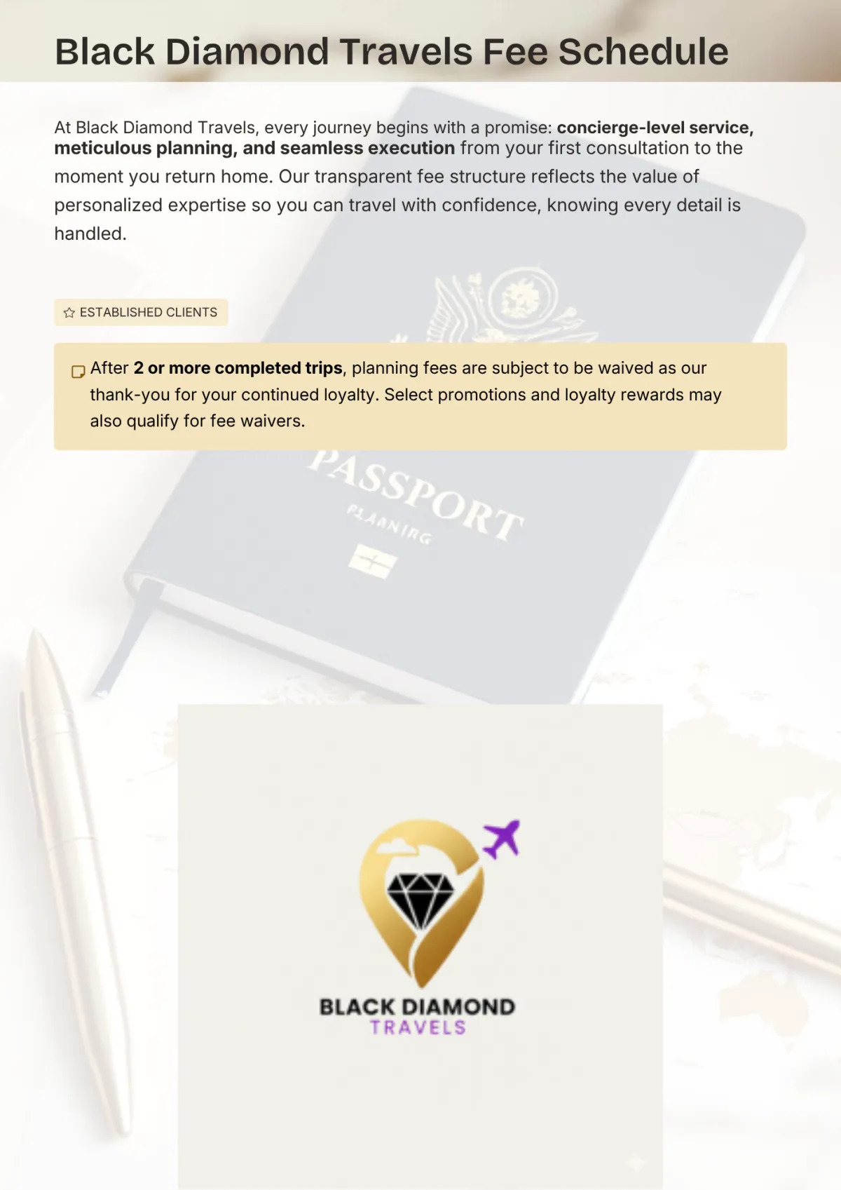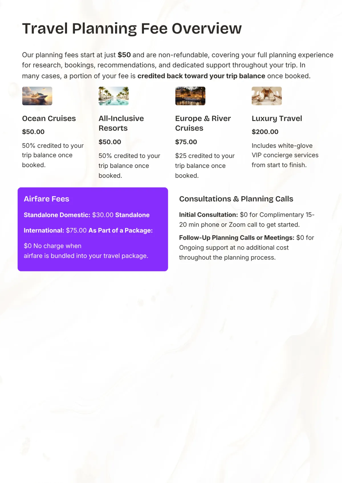 To provide a highly personalized and seamless travel planning experience, my agency charges a non-refundable trip design and planning fee starting at $50 (excluding air-only bookings).