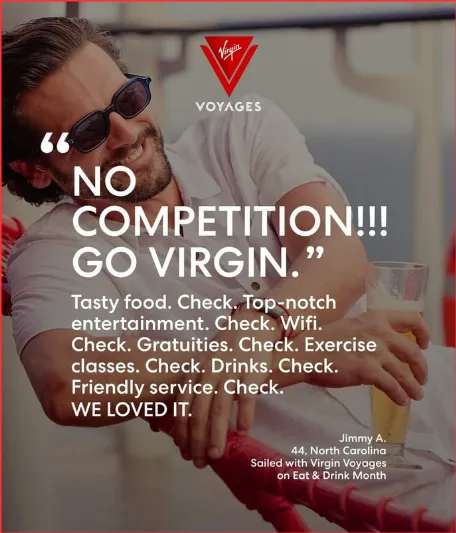"My husband and I would choose a cruise with Virgin every single time. Everything they include means you arenβt constantly reaching