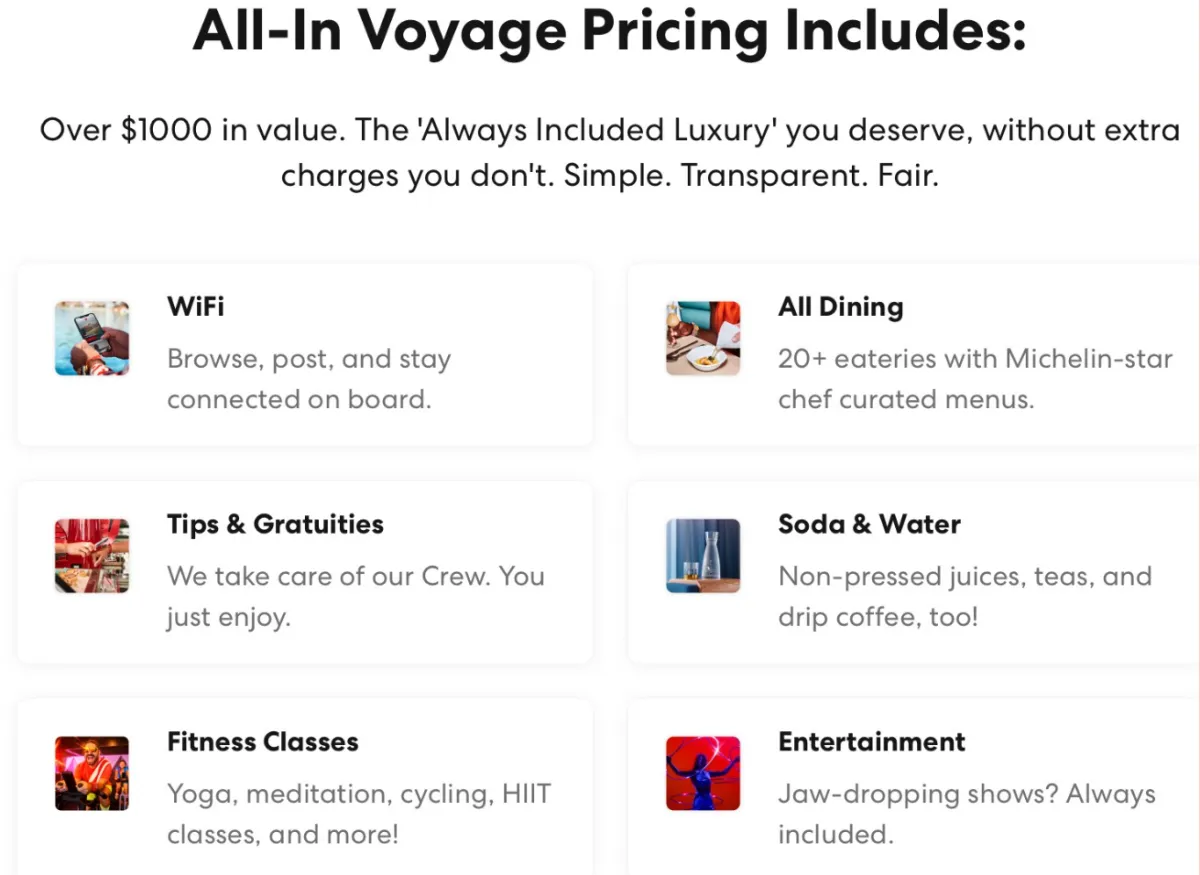 include dining at our 20+ eateries, entertainment, gratuities, wifi, unlimited fitness classes, still and sparkling water